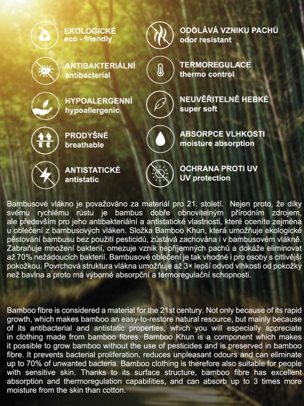 | materiály s obsahem bambusového vlákna oceníte hlavně pro jejich antibakteriální vlastnosti, které zabraňují množení bakterií a vzniku nepříjemných pachů - vlastnost dodává prádlu výjimečný komfort a předurčuje ho jako velmi dobrou volbu jak pro osoby s citlivější pokožkou, tak pro sportovně aktivní osoby | |